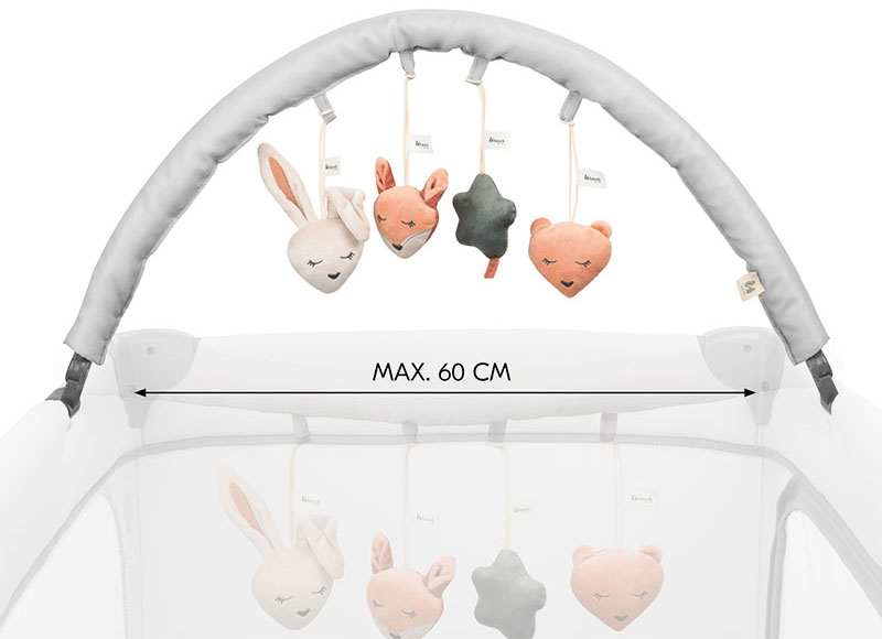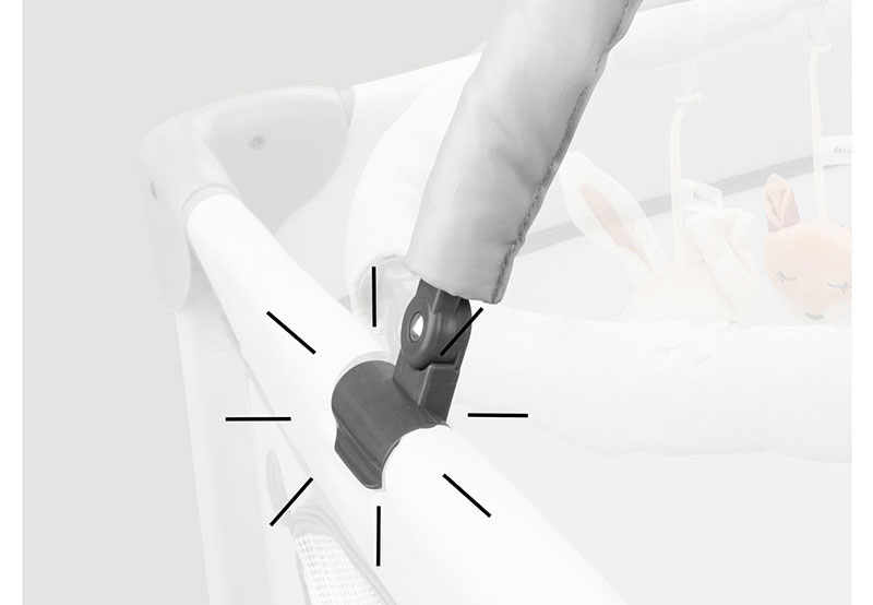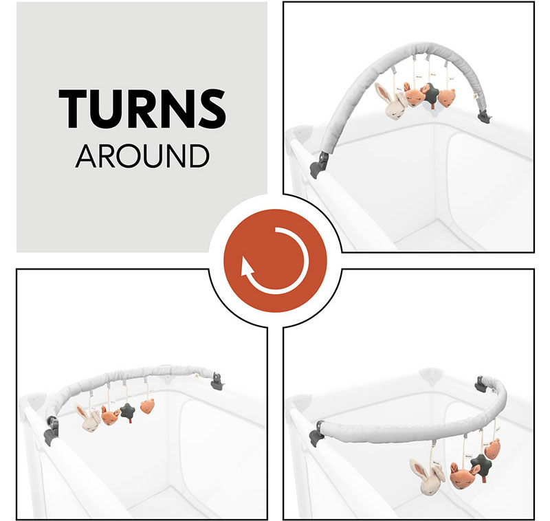 Нямате нужда от инструменти за Travel Bed Mobile. Можете бързо и лесно да закрепите арката към вашата сгъваема бебешка кошара.