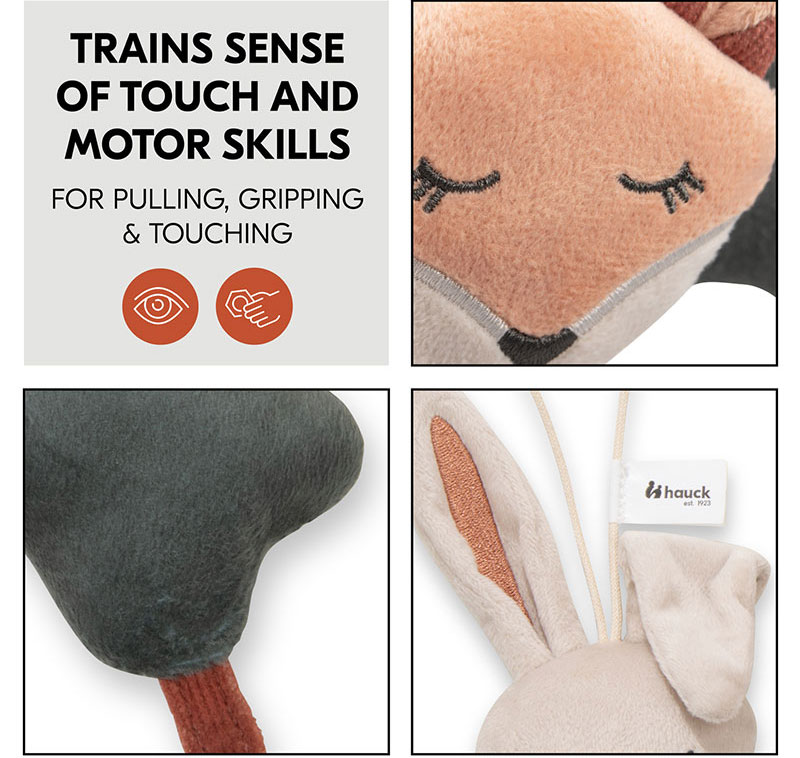 Приятели за докосване: вашето бебе може да дърпа, мачка, гушка, хваща и изследва очарователните животни. Това тренира усещането за допир и двигателните умения на вашето бебе.