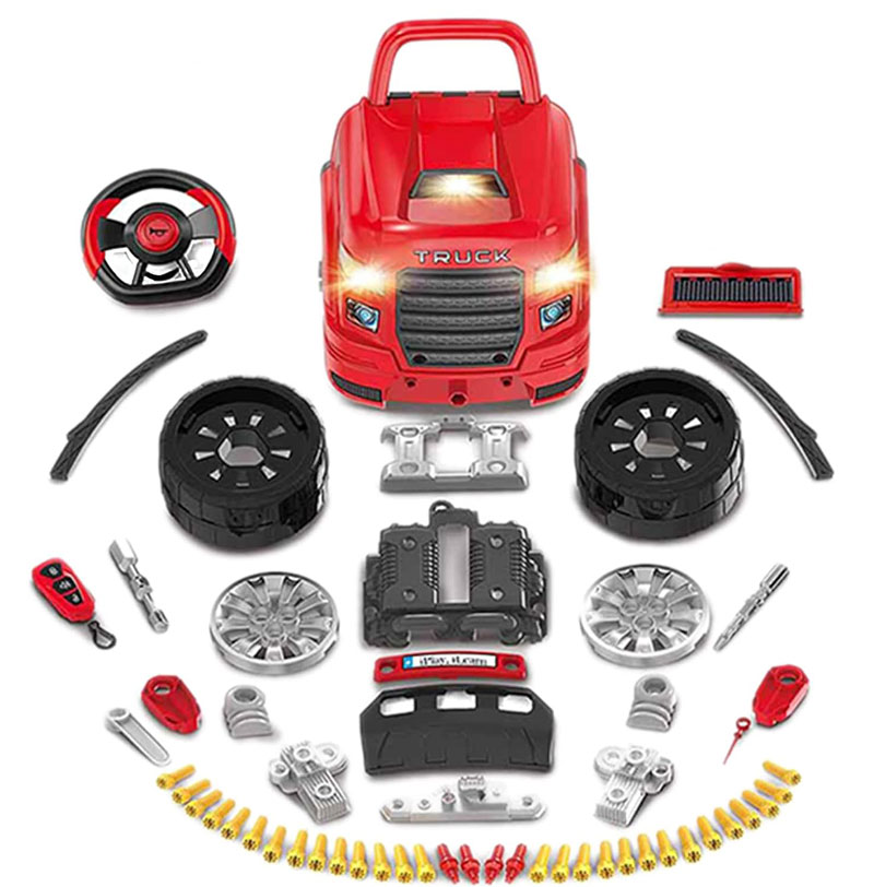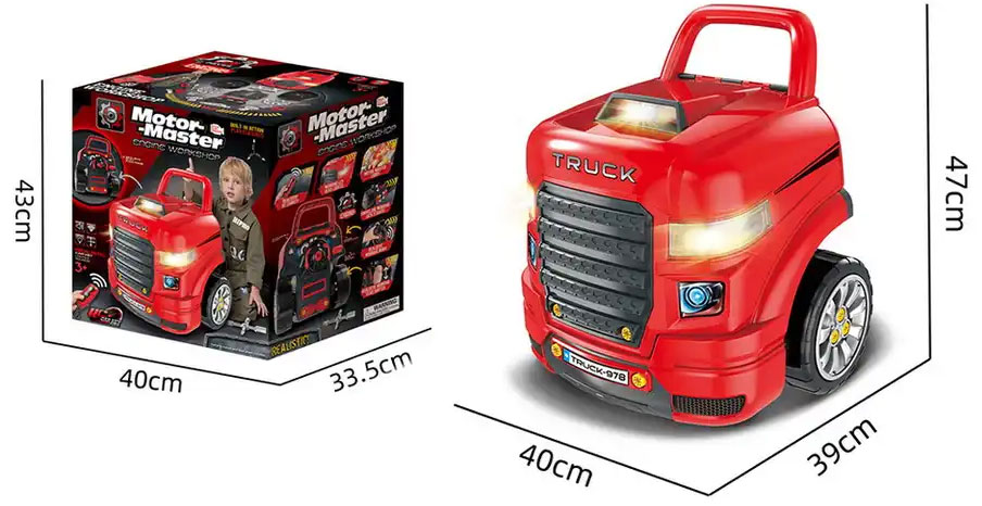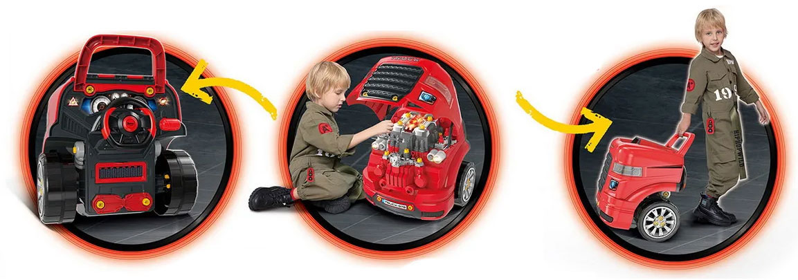 Страхотна интерактивна детска играчка, която ще зарадва всеки малък почитател на автомобилите! С този комплект от 61 части, малчуганът ще може да прави поправки и проверки по двигателя и гумите на своя камион, да се забавлява с автомобилното табло, както и включеното автомобилно дистанционно!