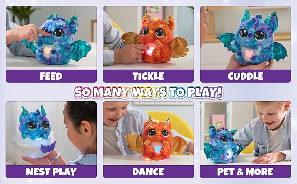 - 100+ звуци и реакции: Говорете, гъделичкайте, хранете и танцувайте с вашия Hatchimal. Той дори може да движи крилцата си и да играе игри като "Peek-a-Boo".