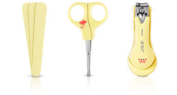 Пълен комплект за грижа за ноктите и косата с ножица със заоблени върхове, нокторезачка и три пилички. И комплект за грижа за косата със заоблен гребен и мека четка за коса.