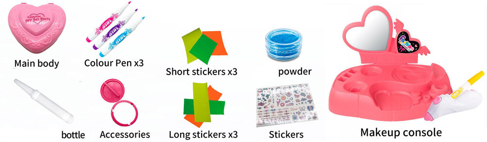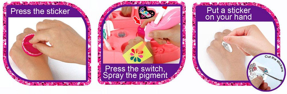 Подреди всичко на специалната конзола с огледалце и започни да твориш! Вземи стикер, натисни го добре с включения помощен инструмент за притискане, след това зареди желания цвят в машинката и натисни бутона, за да оцветиш шаблона. Също като истински татуировчик! Можеш да изсипеш блясък в специалния контейнер, оформен като химикалка, да го поставиш в машинката за татуировки и така да направиш своята татуировка бляскава! Татуировките се премахват с влажна кърпа - използвай включения съд за вода.