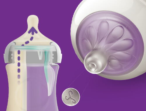 Вграденият в биберона Natural Response вентил против колики предотвратява навлизането на въздух в корема на бебето по време на хранене, за да помогне за намаляване на коликите и дискомфорта.