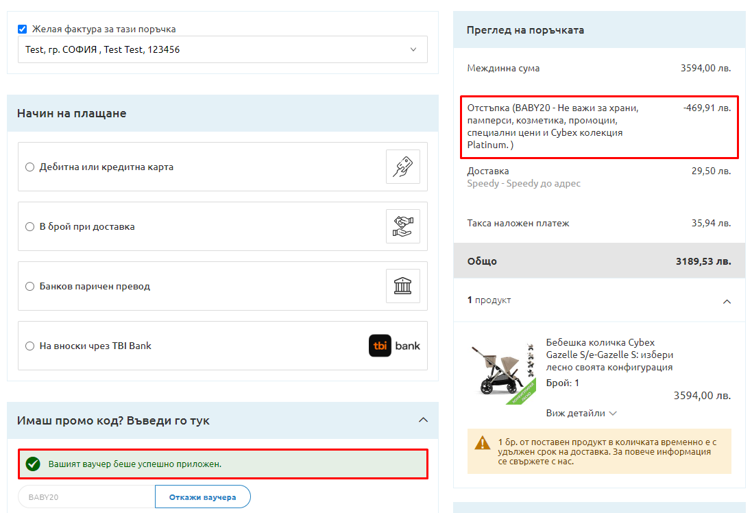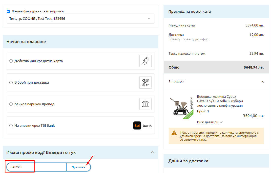 Промокод BABY20 се въвежда при завършване на вашата поръчка: