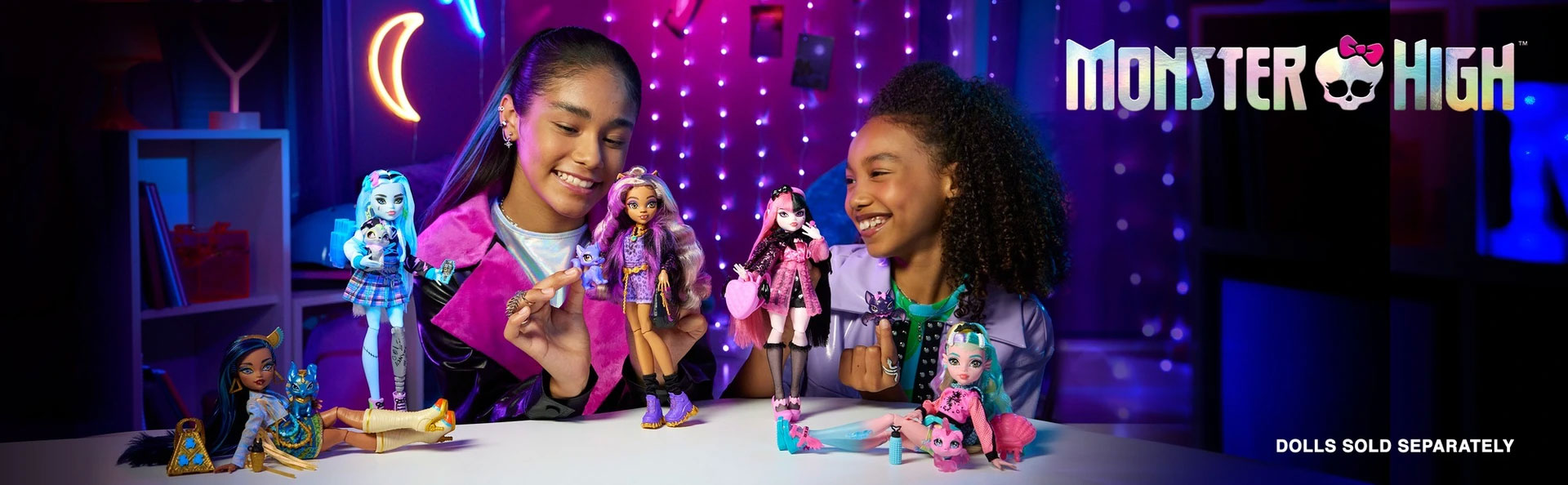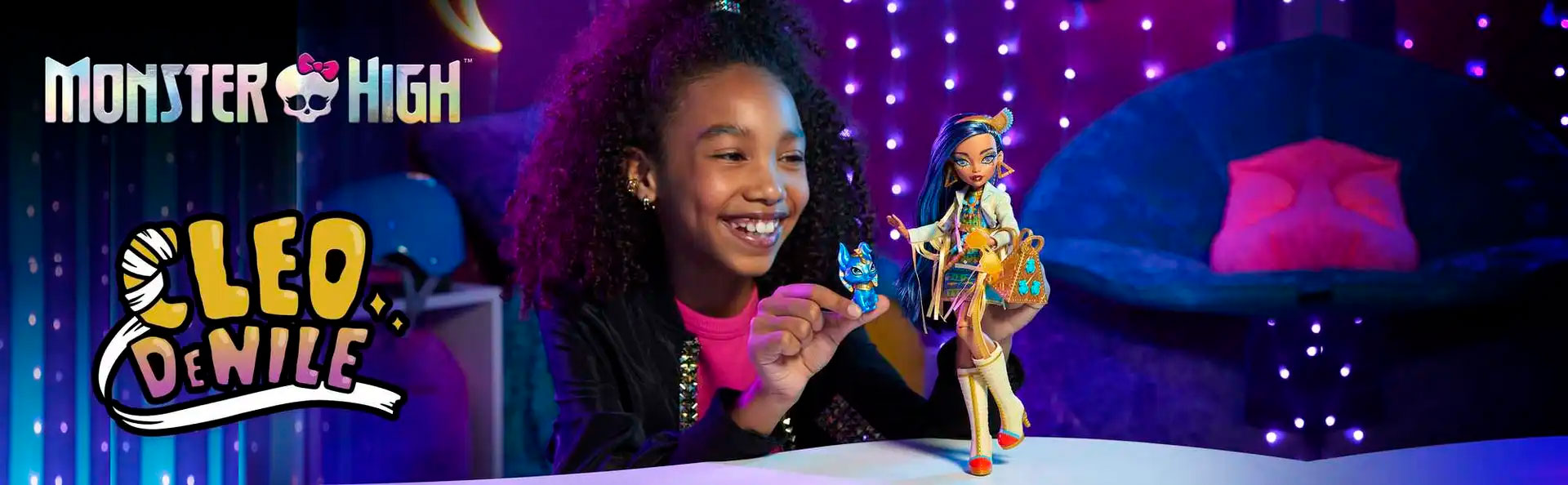 Училището отново започва, а призраците от Monster High се появяват в стил на крясък! Куклата Cleo De Nile се разхожда по коридорите на Monster High в невероятен тоалет, включващ кралско синя рокля с ръкави, вдъхновени от обвивка на мумия и колан с верижка, вдъхновен от кръв. Нейният страховито-шикозен външен вид е допълнен с високи до коляното ботуши, раница във формата на пирамида, украсена със скарабей и бляскави златни аксесоари.