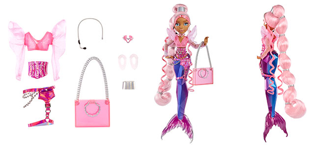 Красивата кукла русалка Harmonique има уникална, изваяна опашка с магическа промяна на цвета! Когато е потопена в топла вода опашката ѝ се променя от металическо лилаво и розово в сребрист хром. Истинско вълшебство!