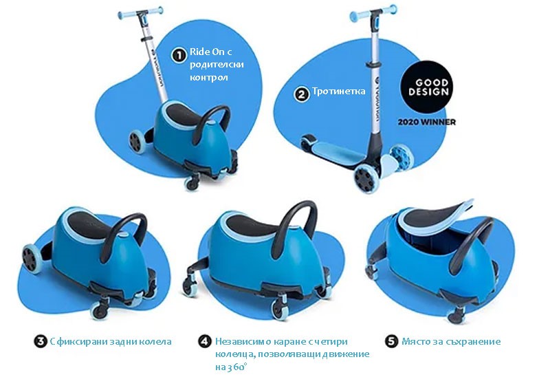 - РЕЖИМ 2 - Контролирано от децата возене без родителски контрол - След като бъде отстранена дръжката на тротинетката от седалката, моделът се превръща в кола за бутане с фиксирани две задни колела.