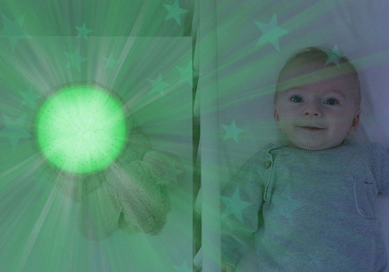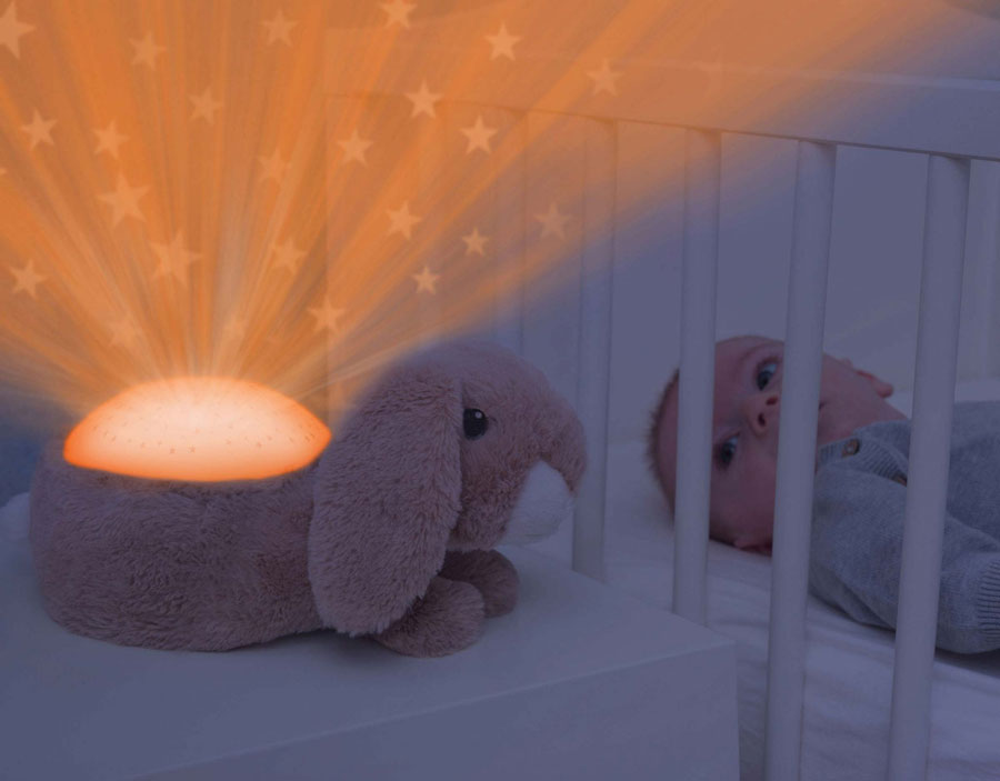 Сладкото зайче Руби прожектира звезди и луна върху тавана в различни цветове, докато възпроизвежда успокояващи звуци като сърдечен ритъм, природни звуци или релакс музика.