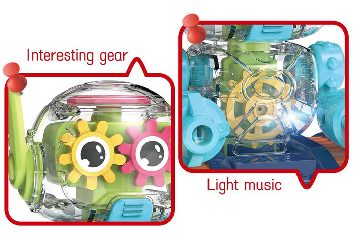 Забавна музикална играчка, оформена като сладко роботче със светлинки, музика и въртящи се във вътрешността му зъбни колела. Истинско забавление за малчуганите!