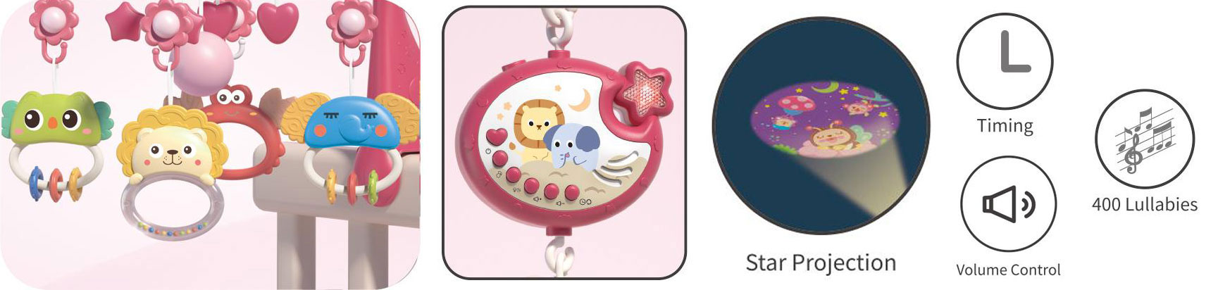 Музикална въртележка за легло и кошара с 4 сладки висящи играчки животинки и нежна ротация на 360°. Тя ще успокои и приспи бебето с нежната си музика и прожектор, прожектиращ звездички по тавана на стаята, създавайки вълшебна атмосфера.