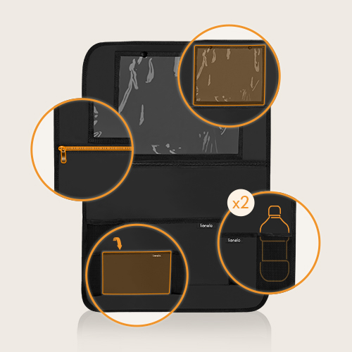 Голям джоб с цип, два по-малки джоба за бутилки или закуски, един малък удобен джоб и джоб за таблет помагат за поддържане на ред в колата и осигуряват лесен достъп до всичко необходимо по време на пътуване.