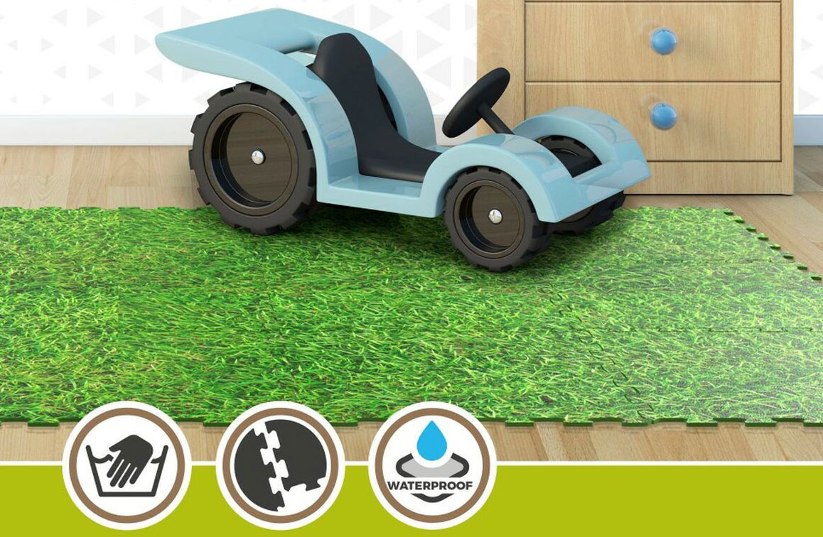 Този детски пъзел за под включва 9 части, всяка от които с размери 30x30x1 см. с дизайн на тревиста полянка. Може да се подреди на пода или да се използва за сглобяване на формички.