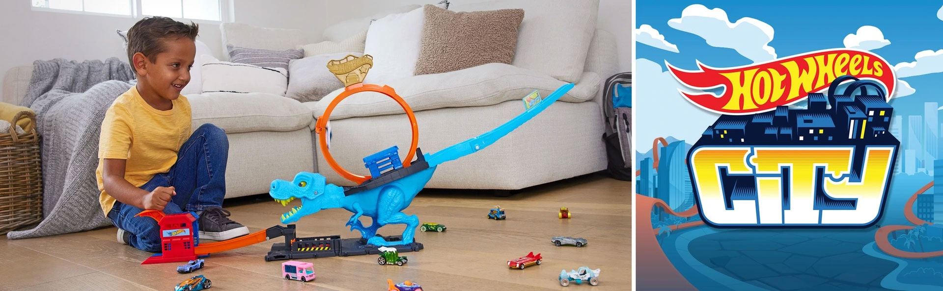 Нокаутирайте динозавъра и спасете положението в комплекта за игра Hot Wheels™ City T-Rex Chomp-Down™. Комплектът разполага с изстрелващ механизъм и 22 сантиметров кръг, където децата изстрелват своите коли Hot Wheel®, за да победят звяра.