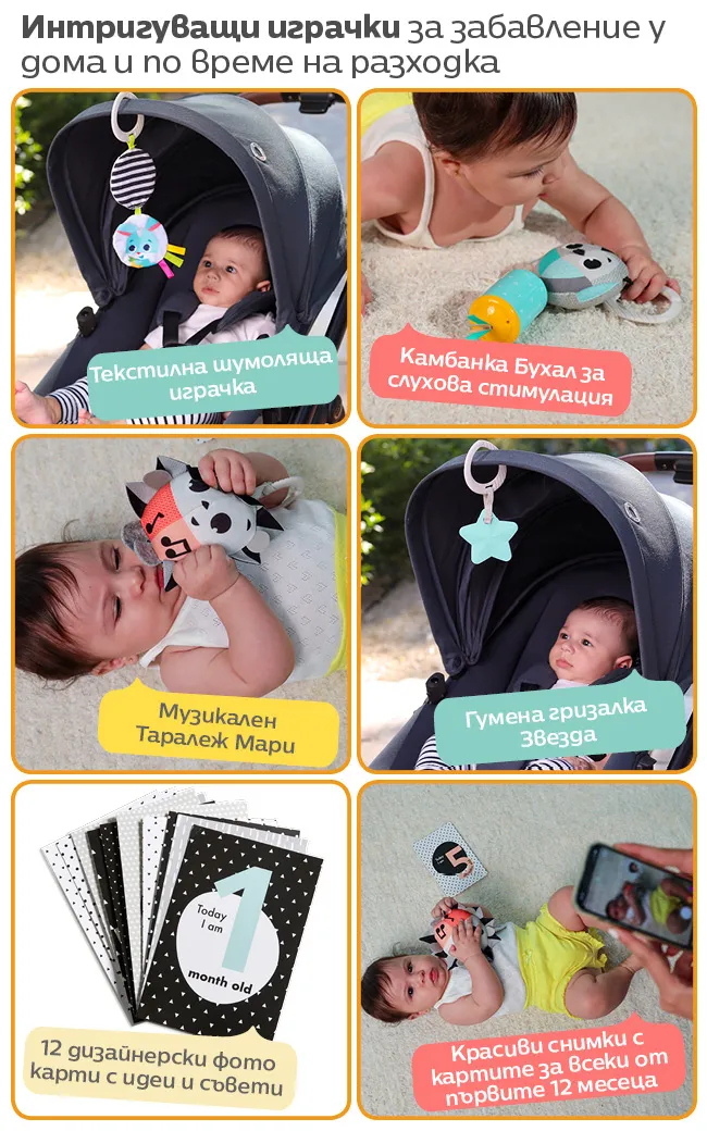 Комплектът включва 4 сензорни играчки с халки Clip & Go за лесно закачане към количка или креватче и 12 карти с етапите на развитие през първата година.