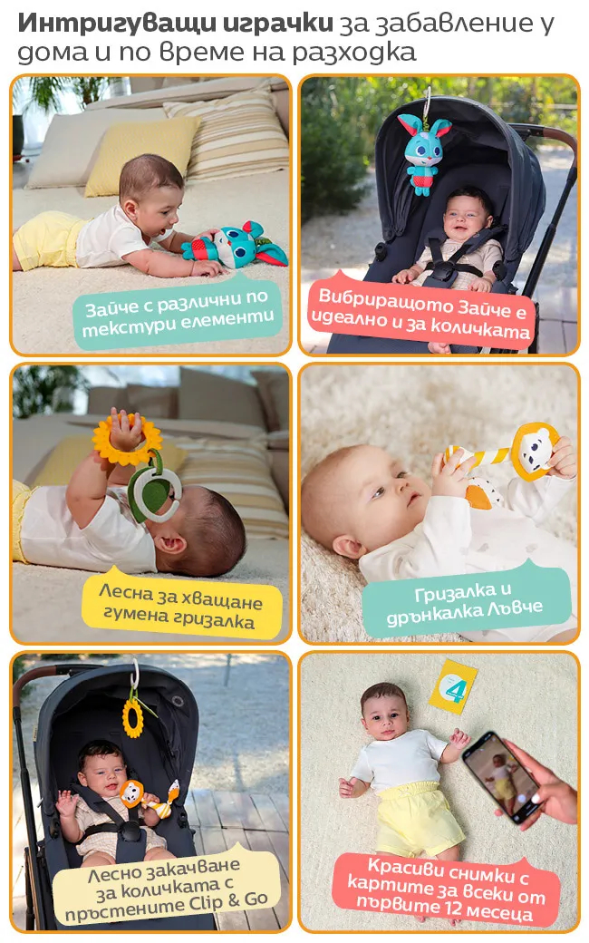 - 2-4+ месеца. Закачете гризалката Слънчоглед в обсега на ръцете на бебето, насърчавайки го да упражнява двигателните си умения.