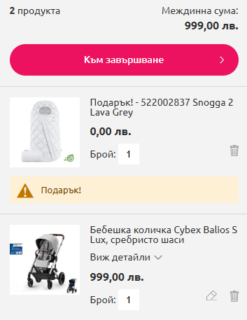Ако премахнете основния продукт от количката, който идва с подарък, подаръкът също ще бъде премахнат автоматично.