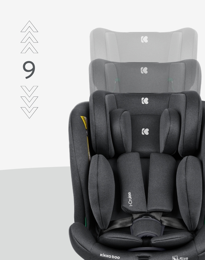 Изберете най-подходящата от 9 позиции на регулируемата облегалка за глава, за да се приспособите столчето към нуждите на растящото дете.