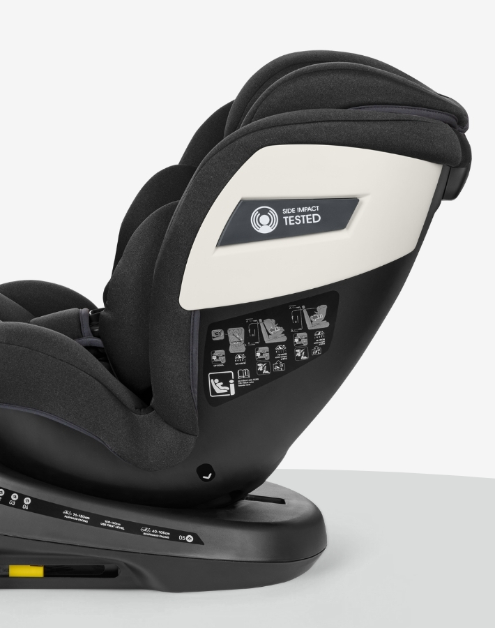 - Персонализиран комфорт – Предлага 4 позиции на наклон на седалката в посока напред и 1 в посока назад. Въртящата се на 360° седалка улеснява поставянето и обезопасяването на бебето в колата.