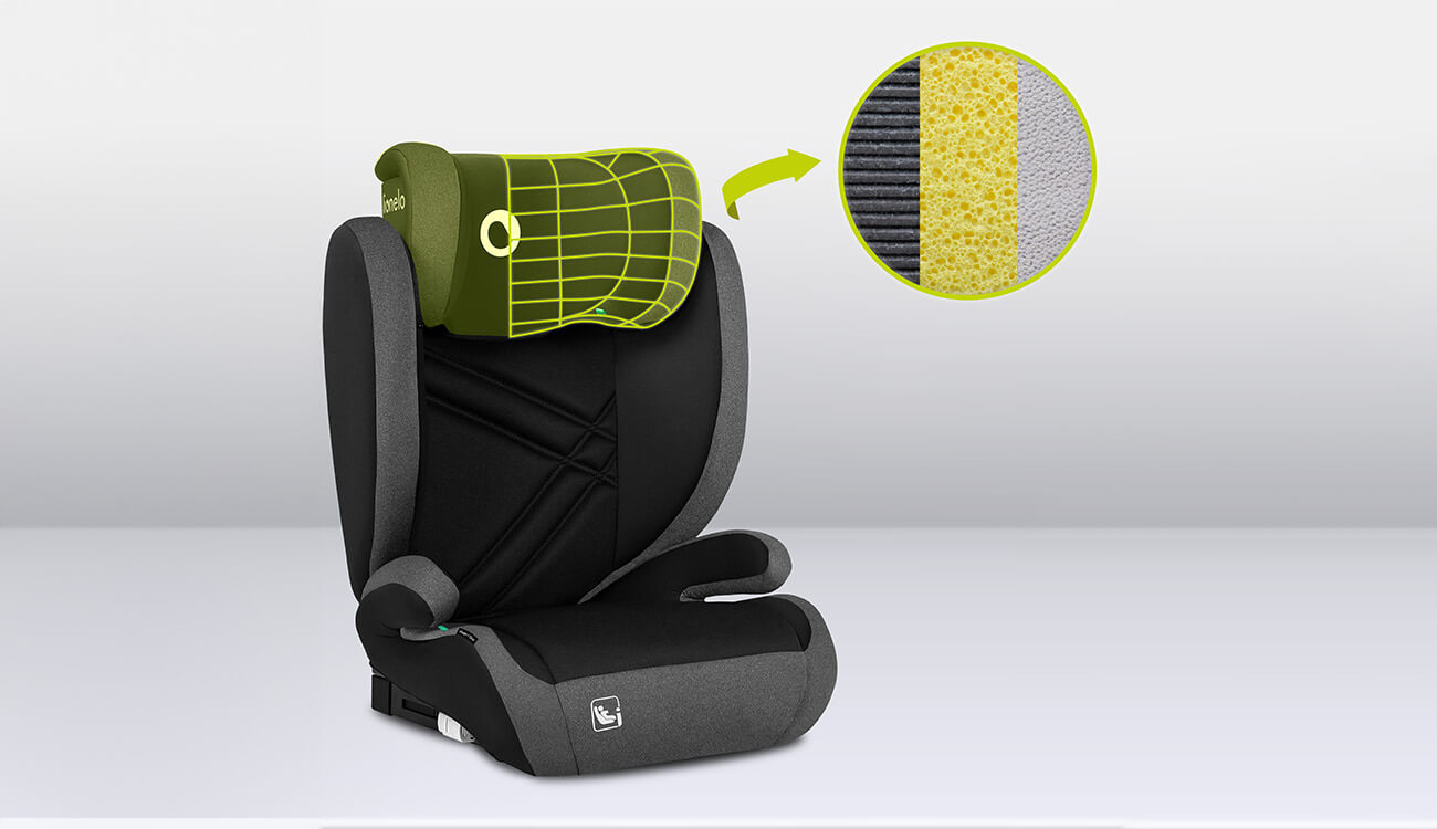 Подложката за глава на столчето е изработена от пластмаса PP и Memory пяна, която абсорбира натоварванията и защитава областта на главата и шията на детето. Пластмасовите водачи улесняват правилното поставяне на колана и поддържат стабилна позиция по време на пътуване.