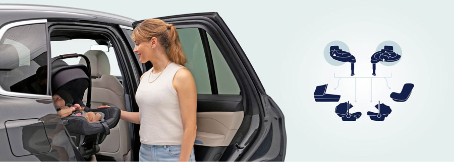 Модулна система, предлагаща две опции за въртящи се на 360° бази и гама от бебешки и преходни столчета за кола, създадени за гъвкаво пътуване през първите четири години.