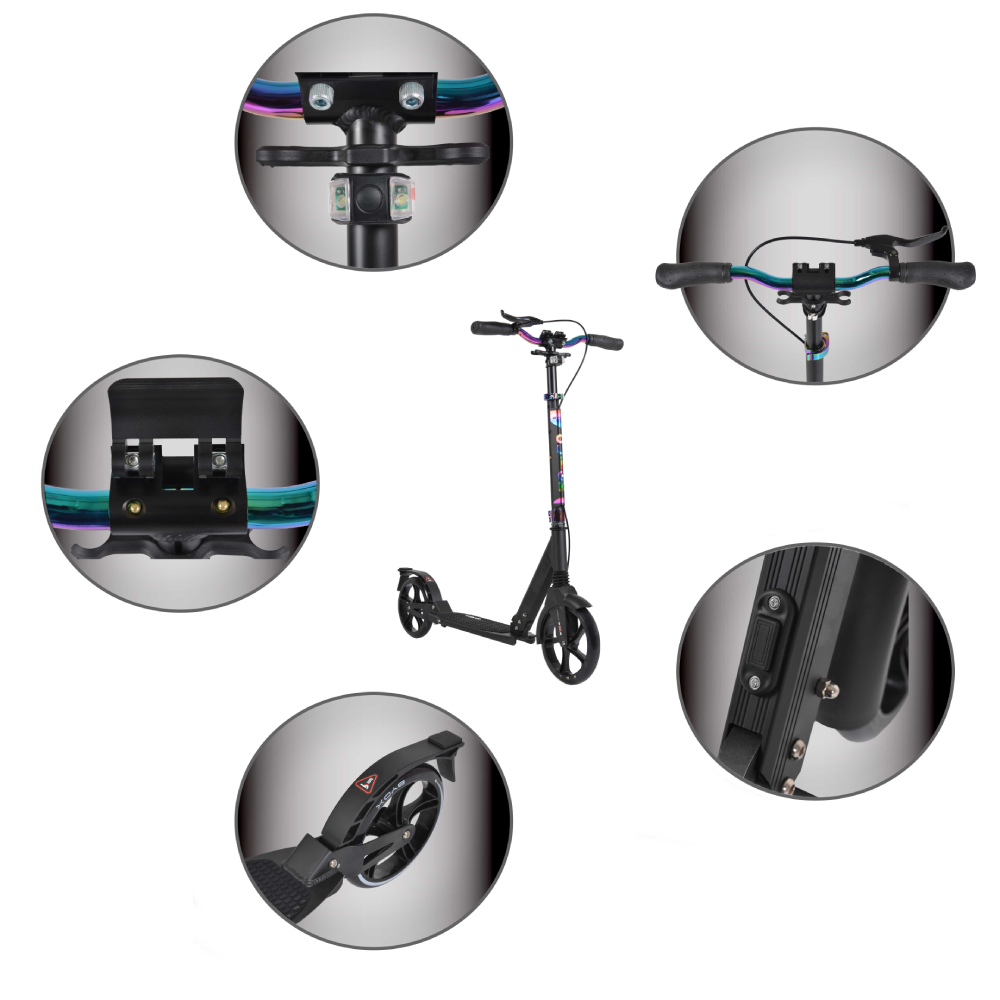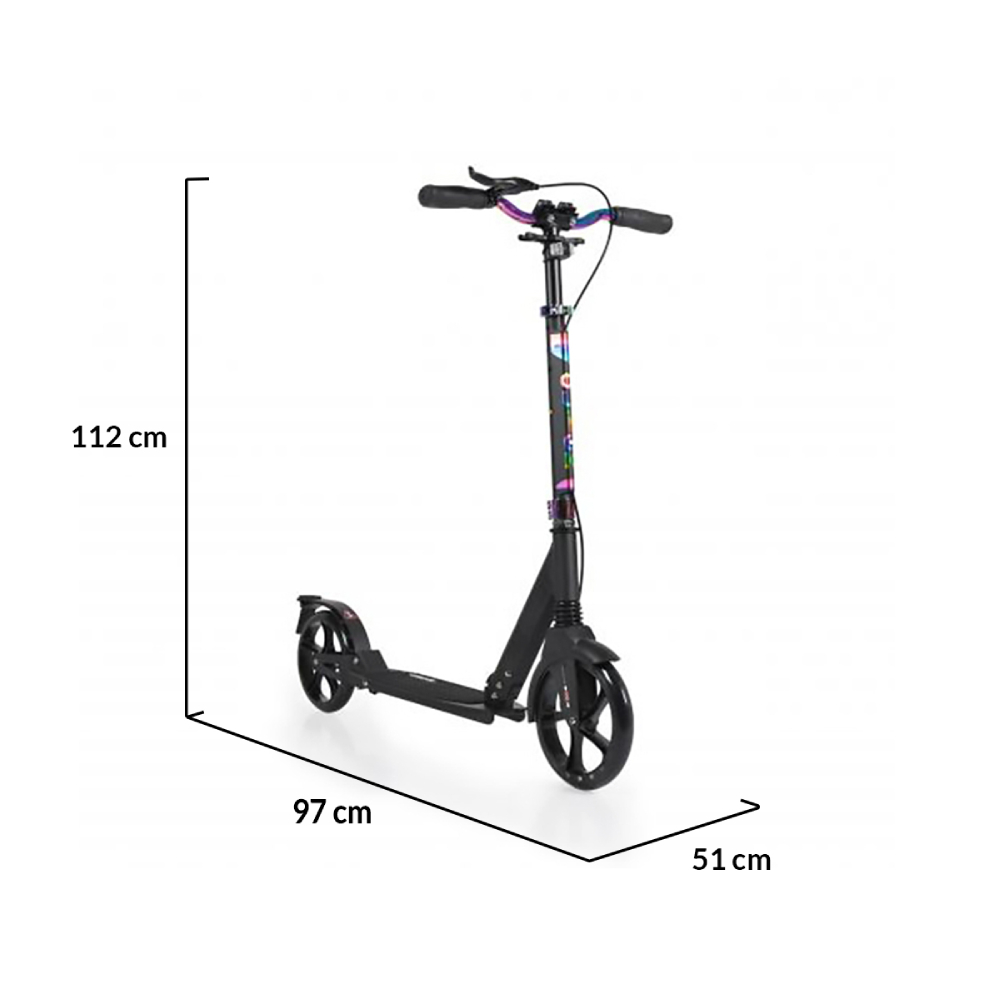 | Характеристики тротинетки | С две гуми, Без родителски контрол, Без седалка, Покритие против хлъзгане, Регулиране на височината на кормилото, Сгъваема, Странична степенка, Ръчна спирачка |