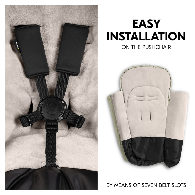 Благодарение на седемте отвора за колани, просторният зимен чувал се монтира лесно и бързо върху вашата количка – дори когато 5-точковите предпазни колани са на различна височина.