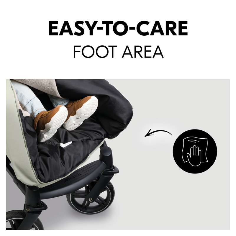 Зоната за крачетата на зимния чувал за количка се почиства много лесно чрез отваряне на двупосочния цип, тъй като вътрешната част е изработена от лесна за поддръжка материя, която може да се забърсва.