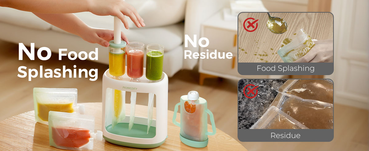 Специалният дизайн на тръбата предотвратява разпръскването на пюрето по време на пълнене. Поддържайте кухненския плот чист и се насладете на бърза и удобна подготовка.