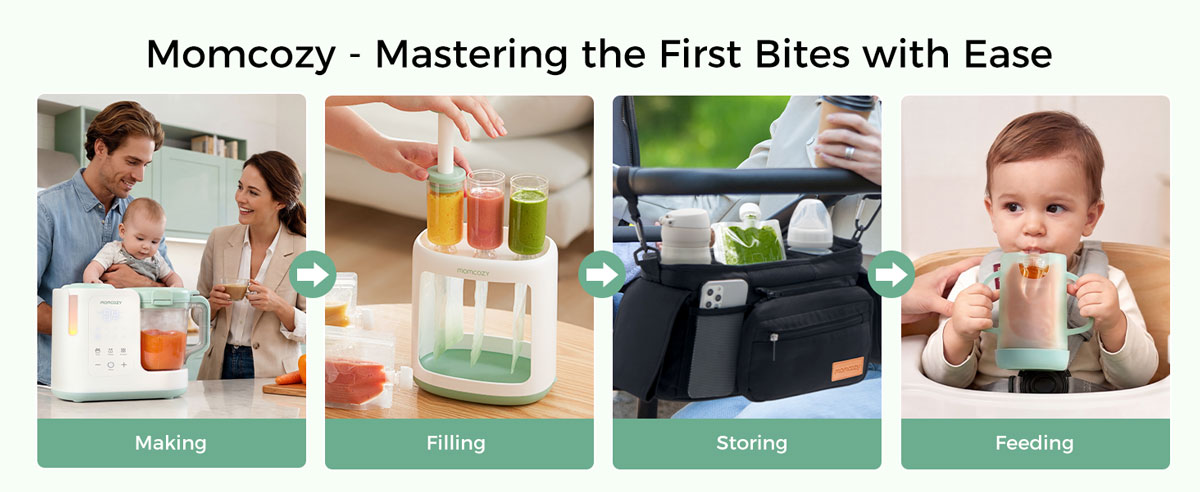 Включва 5 многократни торбички за бебешка храна без BPA – идеални за прясно приготвена домашна храна. Подходящи за фризер и съдомиялна машина, лесни за пренасяне и създадени да намалят отпадъците за по-устойчив начин на хранене.